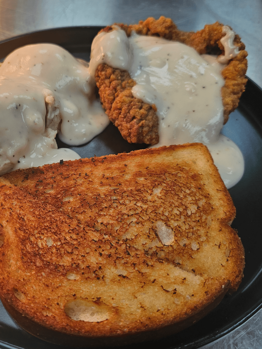 "I had a chicken fried steak, it wasn’t as large as I had expected (I’m from Texas, they’re big in Texas), however, it was the perfect size for me. The breading and gravy were seasoned perfectly! I also had Crawfish Balls, they were great also."